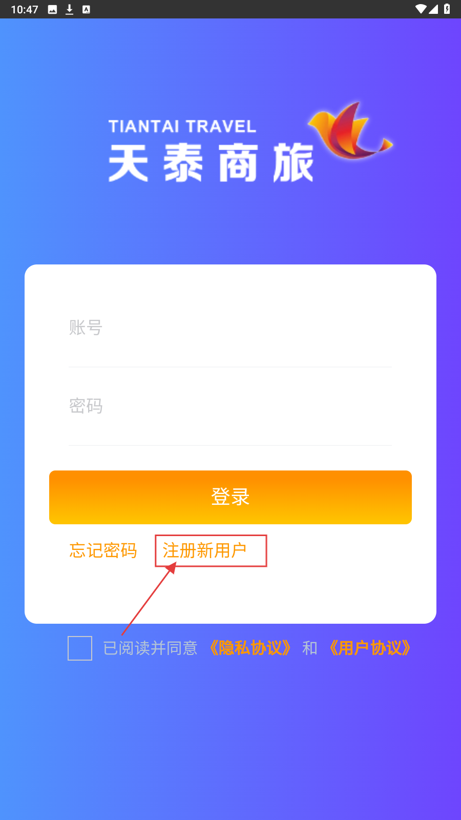 1、打开“天泰商旅”APP登录页,点击【注册新用户】。