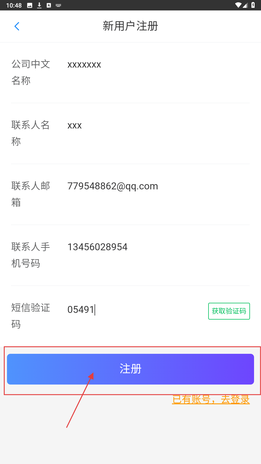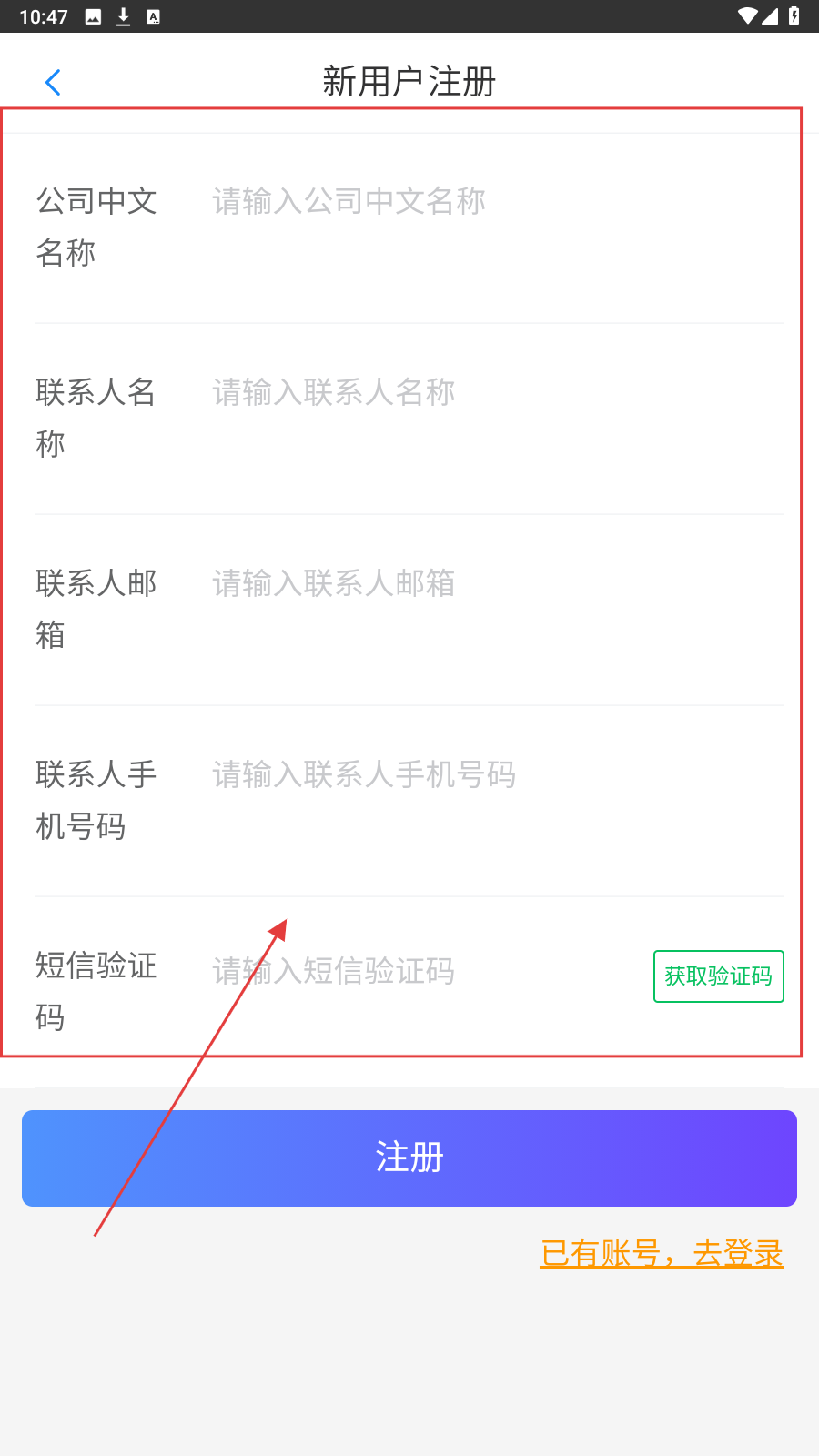 2、进入新用户注册页,填写公司中文名称、联系人名称、联系人邮箱、联系人手机号码,获取并填写短信验证码。