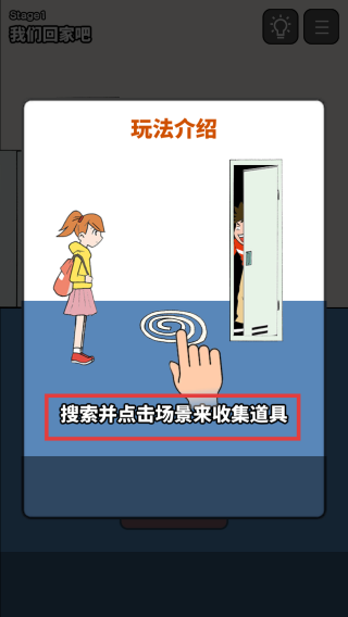 1、进入游戏,根据关卡提示明确目标。按照玩法介绍,在场景中搜索并点击特定位置收集道具,推动关卡进程。