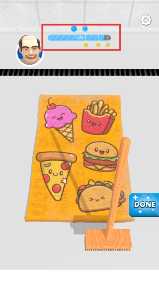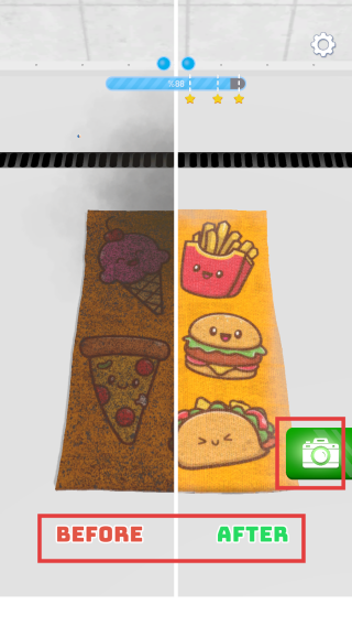 3、当进度条达到较高比例,可点击“DONE”查看清洁效果。游戏会展示清洁前后对比,还可使用拍照功能记录成果,之后继续挑战新关卡。