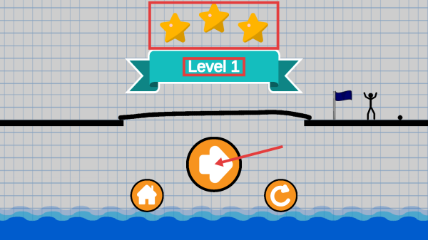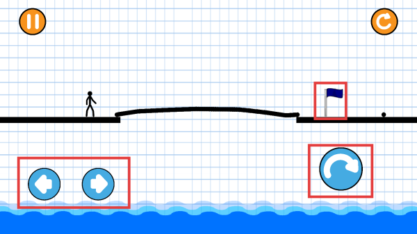 2、进入游戏操作界面,利用左右移动按钮控制火柴人移动,通过绘制桥梁等方式帮助火柴人到达终点旗帜处。