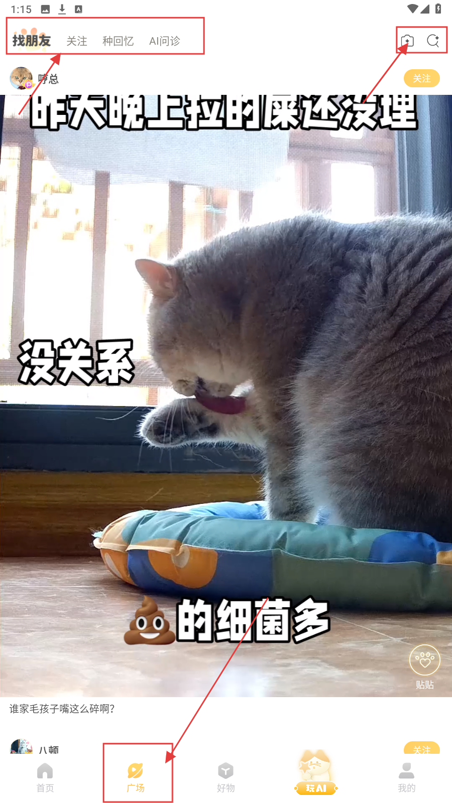 1、打开APP,默认进入【广场】页,有“找朋友、关注”等分类,可浏览萌宠动态(如猫咪日常)。
