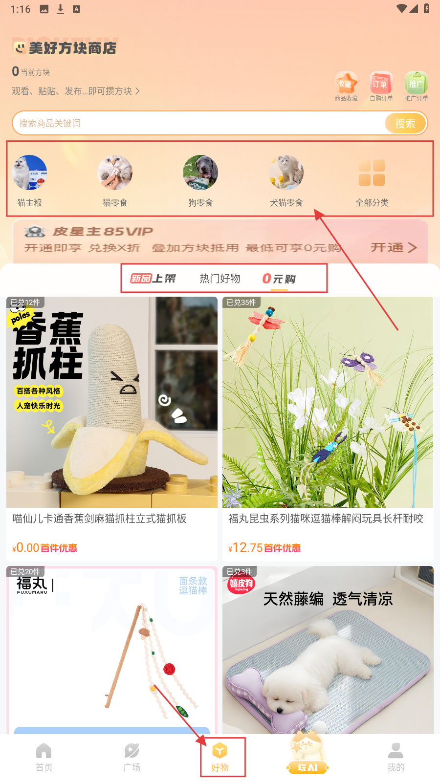 2、切换到【好物】页,进入“美好方块商店”,有“猫主粮、猫零食”等分类,可选购宠物用品(如香蕉抓柱)。