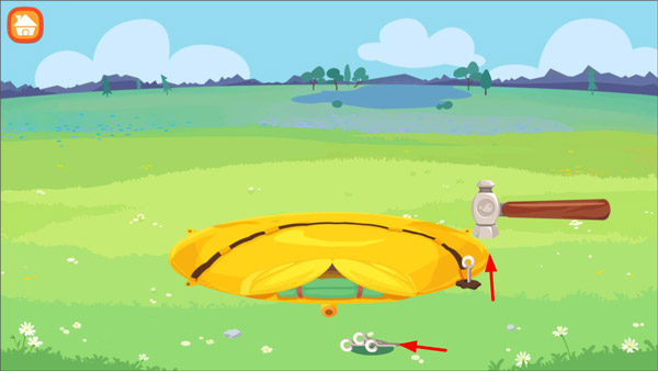 1、游戏开始,在户外草地场景中,按提示使用道具(如用锤子搭建帐篷),完成基础场景布置任务。