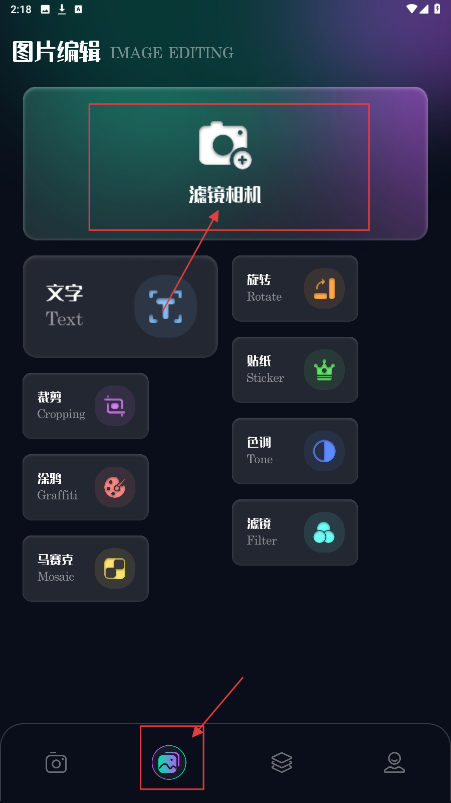 1、打开应用,进入界面,点击【滤镜相机】,可开启带滤镜拍摄;也可点底部功能入口,进入素材选择。