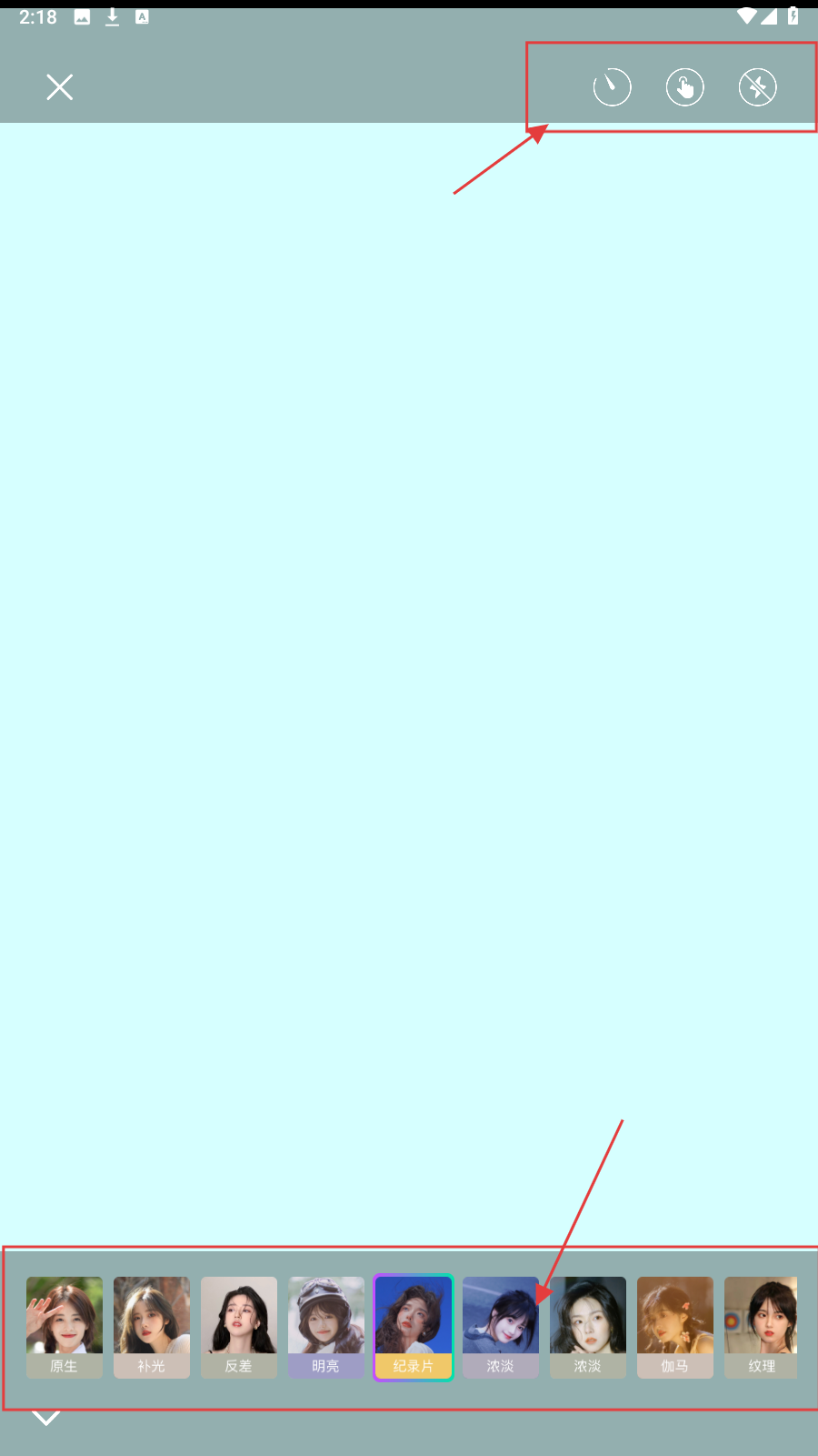2、在滤镜选择页,顶部有拍摄辅助图标(如定时器),底部有原生、补光等滤镜,选合适滤镜应用到画面。