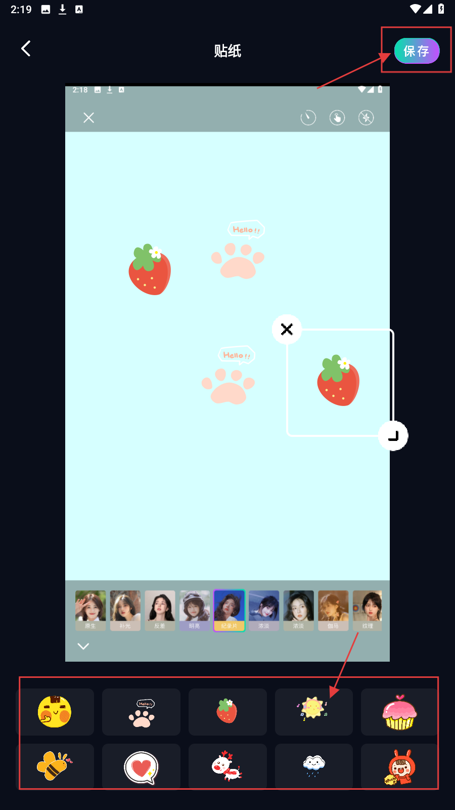 3、切换到贴纸页,底部有草莓、星星等贴纸素材,选贴纸添加到画面,调整位置、大小后,点右上角【保存】,完成图片编辑保存。