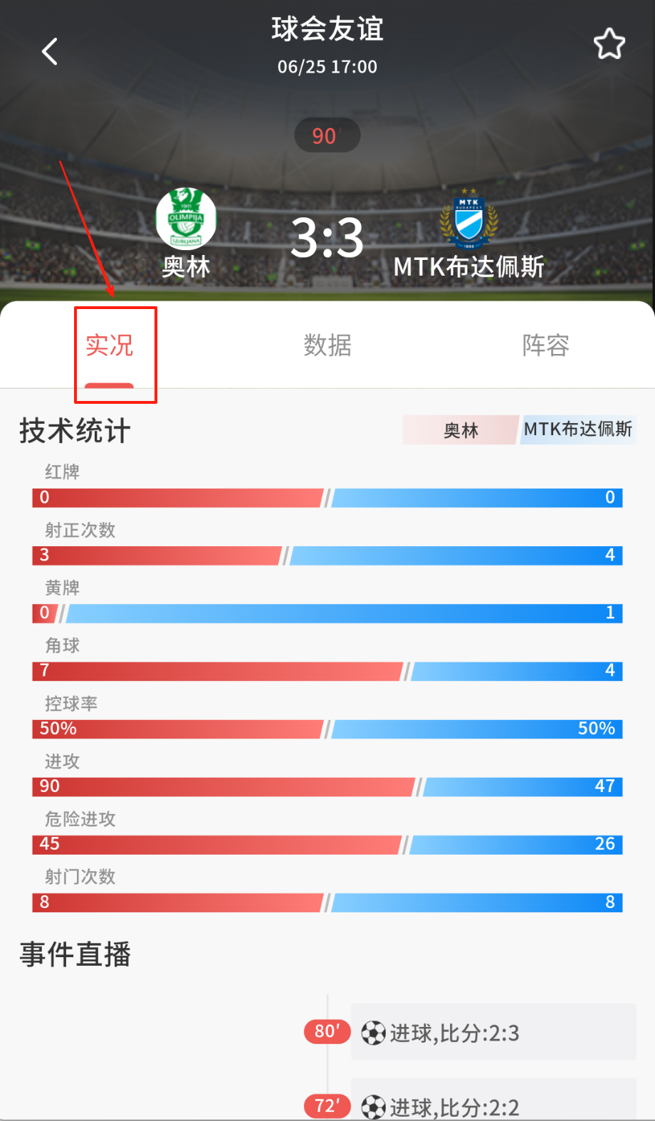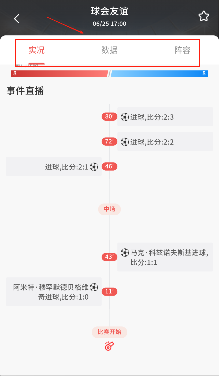 1、选择英超或NBA赛事进入详情页,实时比分悬浮窗展示进球射门等关键数据,滑动切换阵容热力图与控球率变化曲线哦。