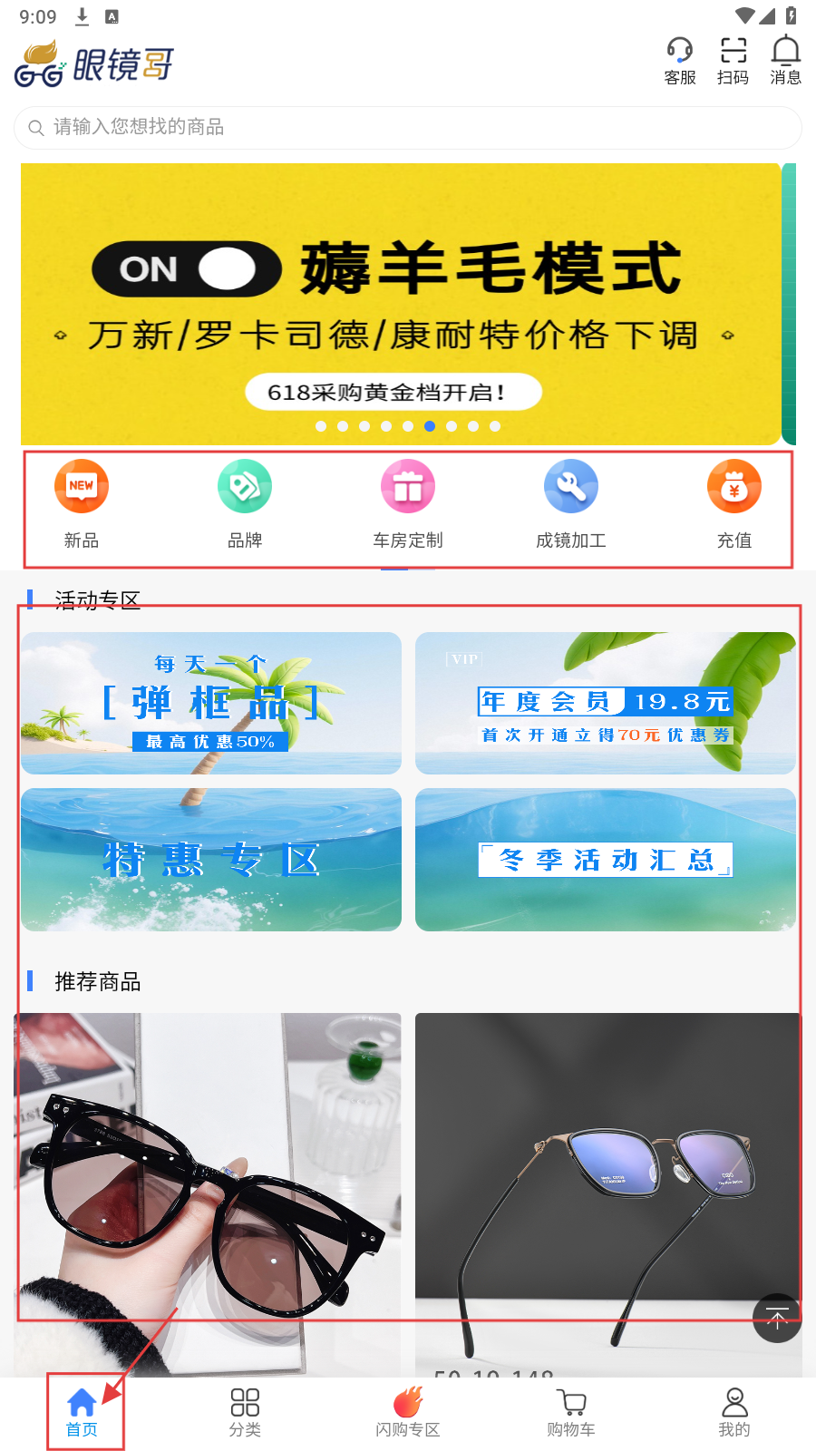 1、打开“眼镜哥”APP,进入【首页】,可浏览新品、品牌等功能及活动、推荐商品。