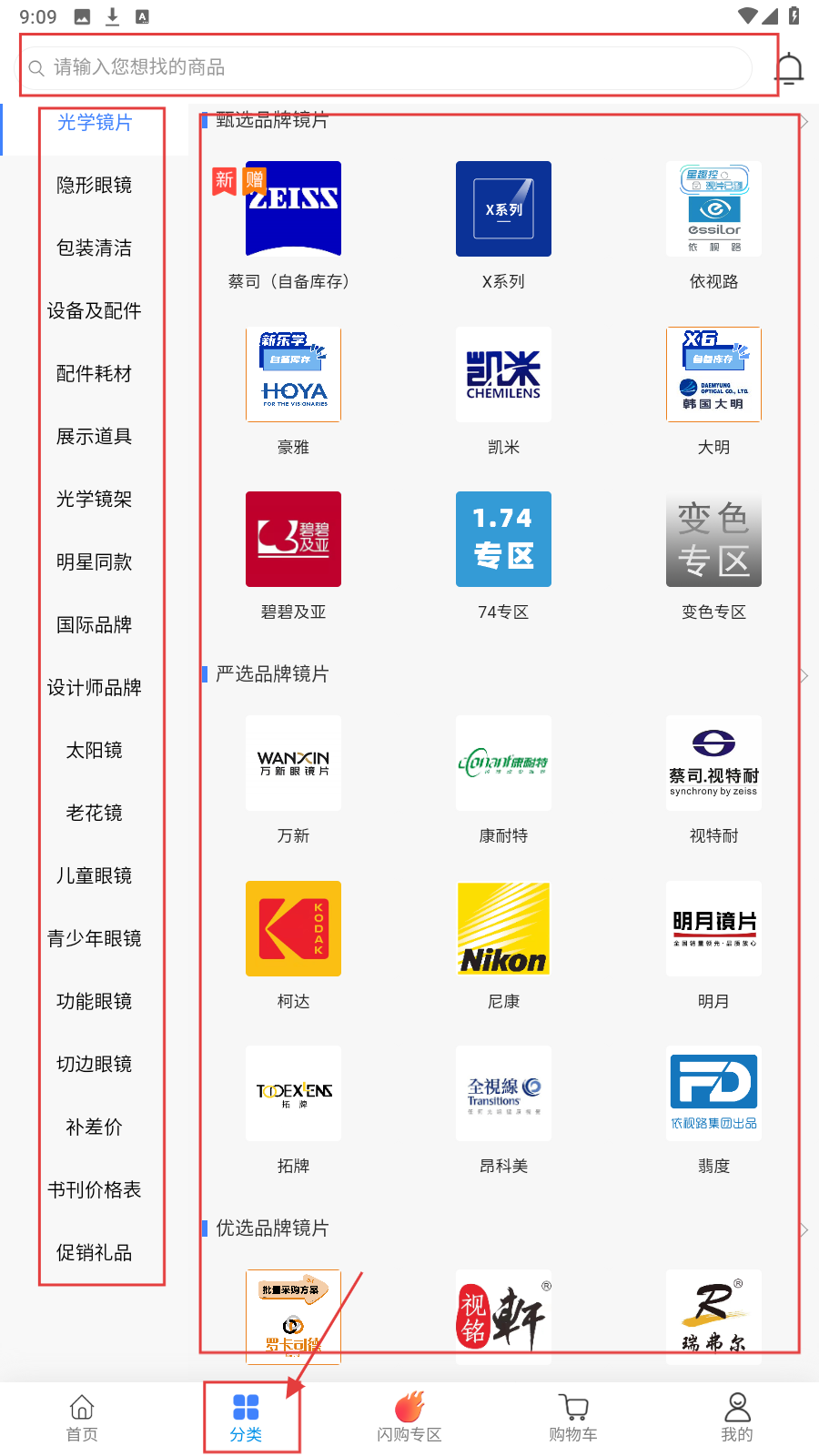 2、点击底部【分类】,左侧选商品类别(如光学镜片),右侧查看蔡司、凯米等品牌镜片。