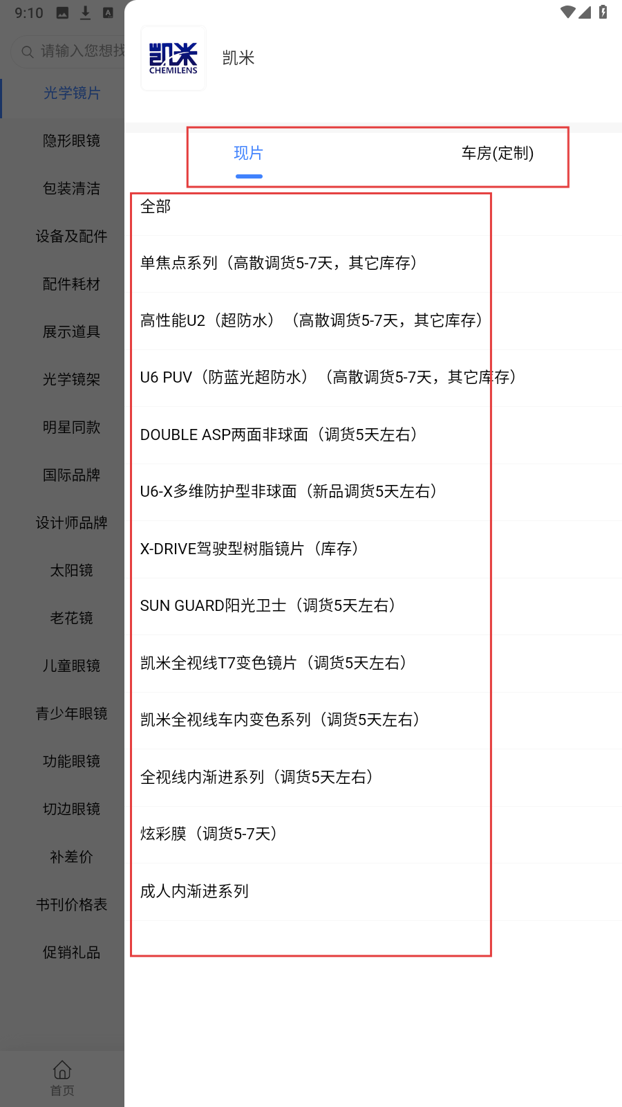 3、进入品牌(如凯米)详情,选【现片/车房(定制)】,查看单焦点、高性能U2等系列镜片及库存、调货信息,按需选购即可。