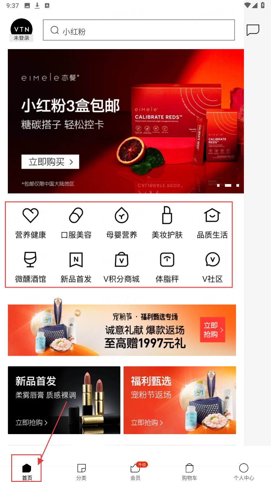 1、打开VTN应用,进入【首页】,可浏览营养健康、口服美容等分类,还有新品首发、宠粉节活动及推荐商品。
