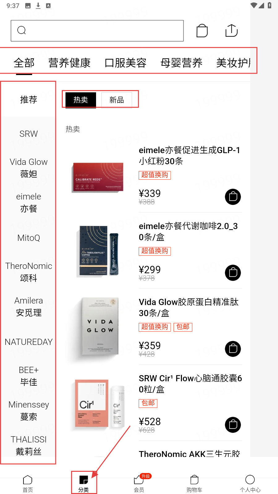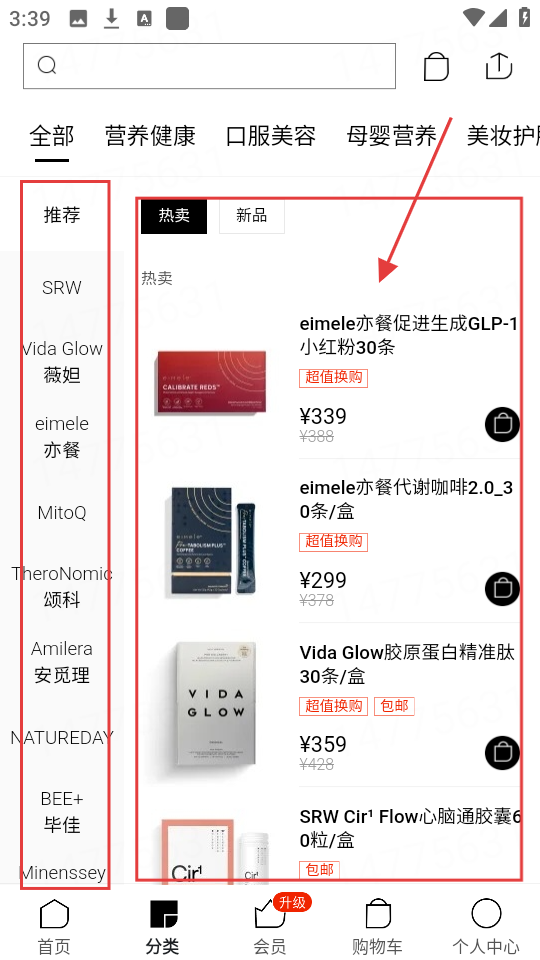 2、点击底部【分类】,顶部选商品类别(如营养健康),左侧选品牌(如eimele亦餐),右侧查看热卖、新品商品列表。