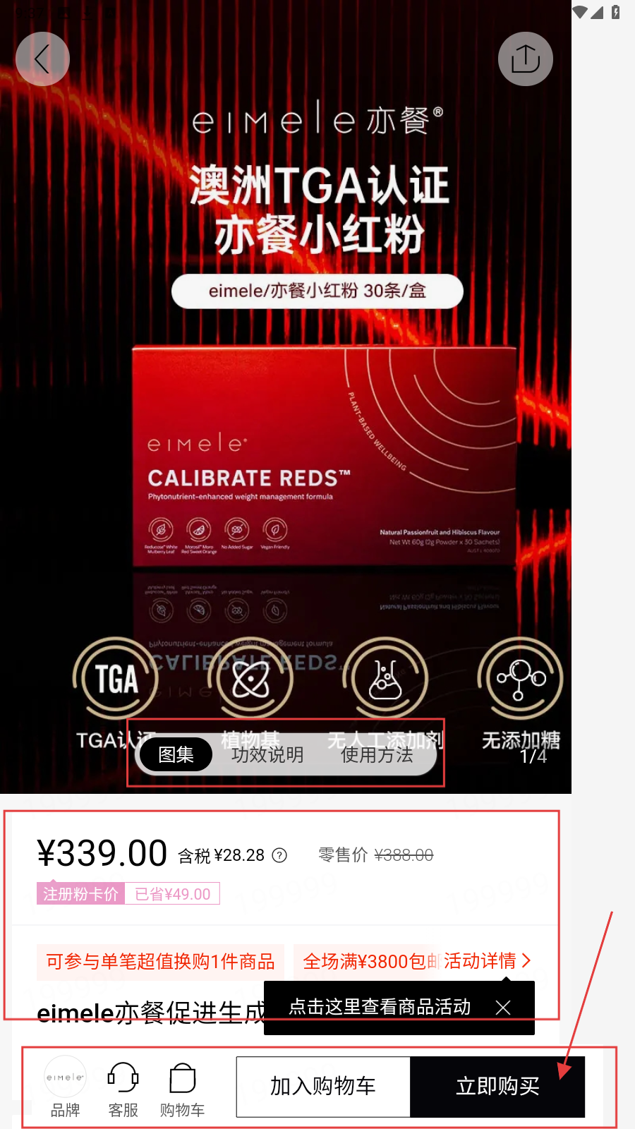 3、进入商品(如eimele亦餐小红粉)详情页,可看图集、功效说明等,了解价格、活动后,点【加入购物车】或【立即购买】完成选购。