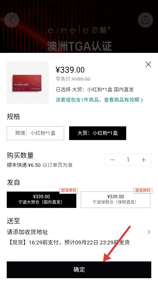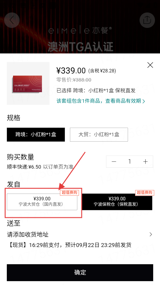 3、选好规格,确认【宁波大贸仓(国内直发)】发货仓,点确定,就到确认订单页面啦。