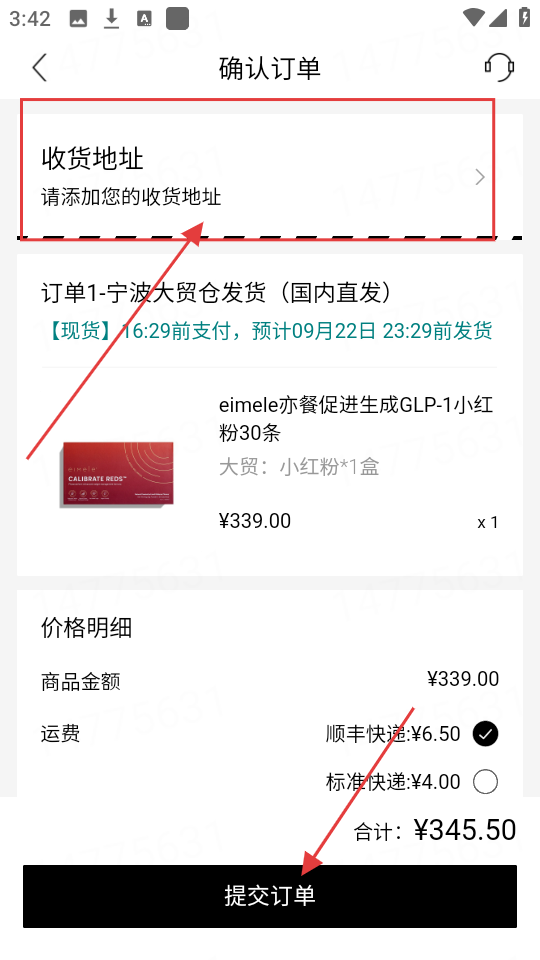 4、确认订单页,添加【收货地址】,选运费方式,都弄好点【提交订单】,就能买啦。