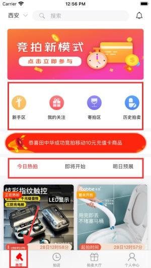 1、打开APP,进入【首页】,可参与竞拍新模式,使用新手区、我的关注等功能,查看今日热拍商品。