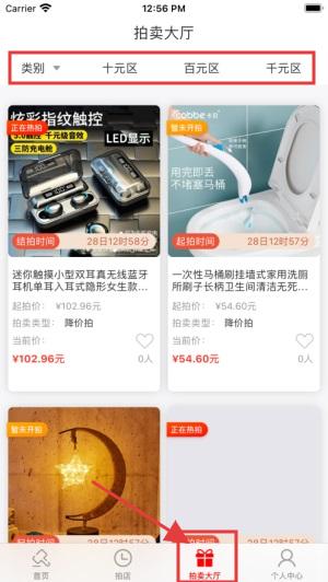 2、点击底部【拍卖大厅】,按类别(十元区等)浏览正在竞拍商品,如炫彩指纹触控、马桶等。