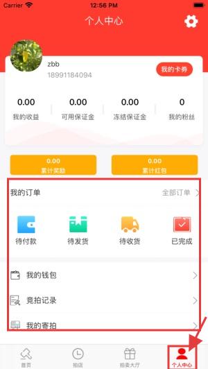 3、切换到【个人中心】,查看我的订单(待付款等)、我的钱包等信息,管理个人竞拍相关业务。
