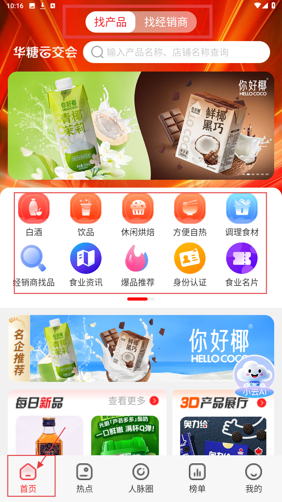 1、打开应用,进入【首页】,可切换“找产品/找经销商”,用搜索栏查询,点白酒、饮品等分类入口,浏览名企推荐、每日新品等。