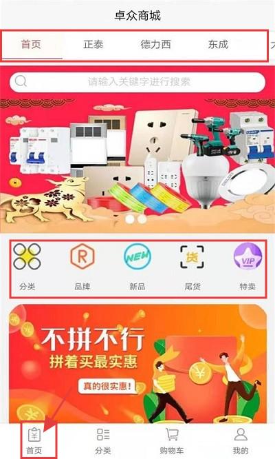 1、打开“卓众商城”APP,进入【首页】,可切换正泰、德力西等品牌页,用搜索栏找商品,通过分类、品牌等入口浏览。