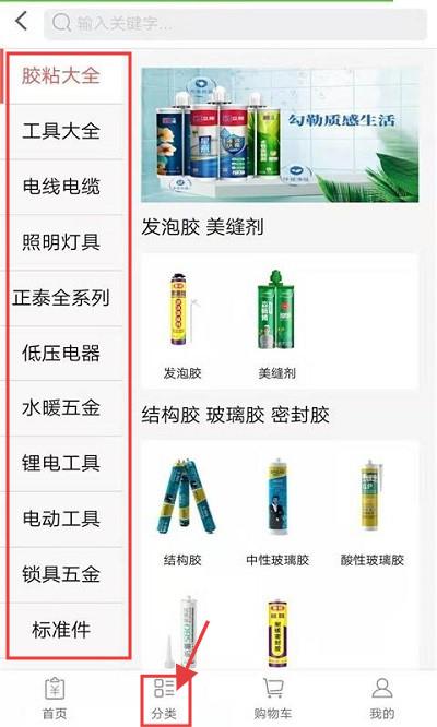 2、点击底部【分类】,左侧选类别(如胶粘大全、工具大全),右侧查看发泡胶、美缝剂等商品,按需浏览选购。