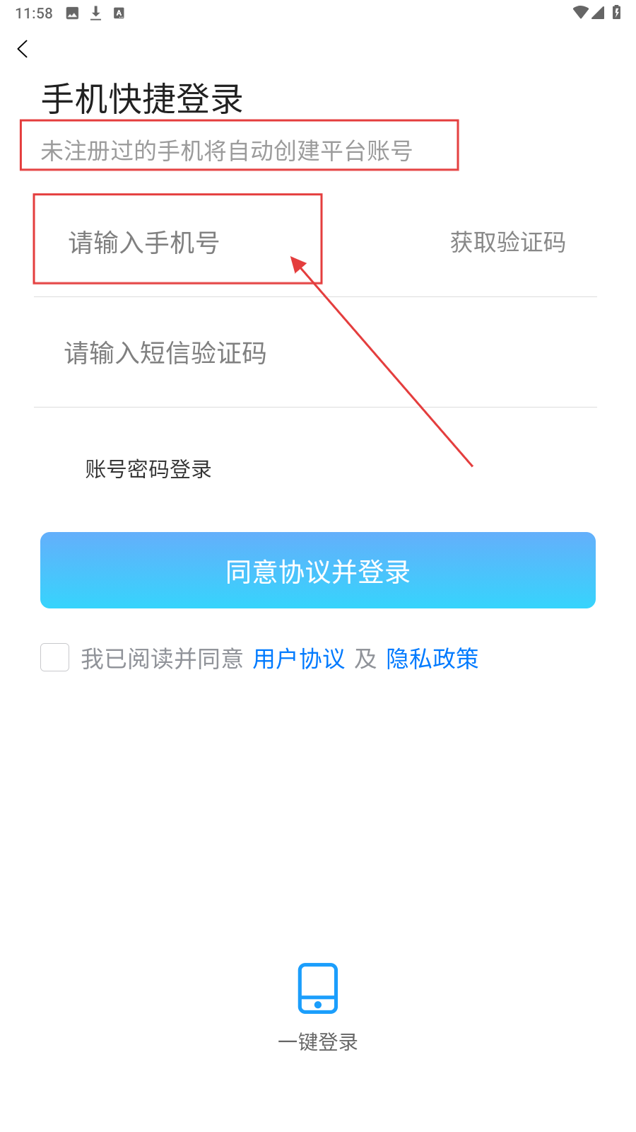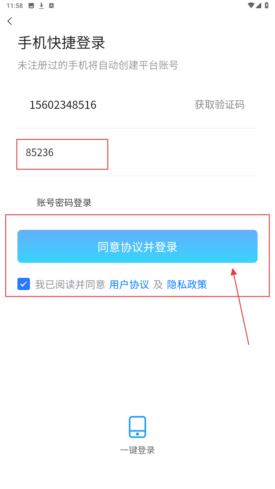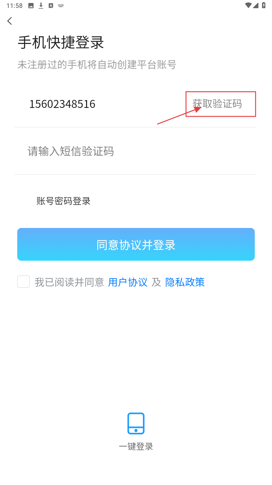 2、收验证码后填入,勾选同意协议。
