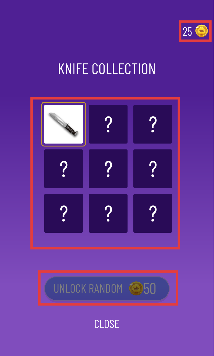 2、完成关卡后,可获得金币奖励。积累金币后,进入“KNIFECOLLECTION”界面,花费50金币点击“UNLOCKRANDOM”解锁随机刀具。