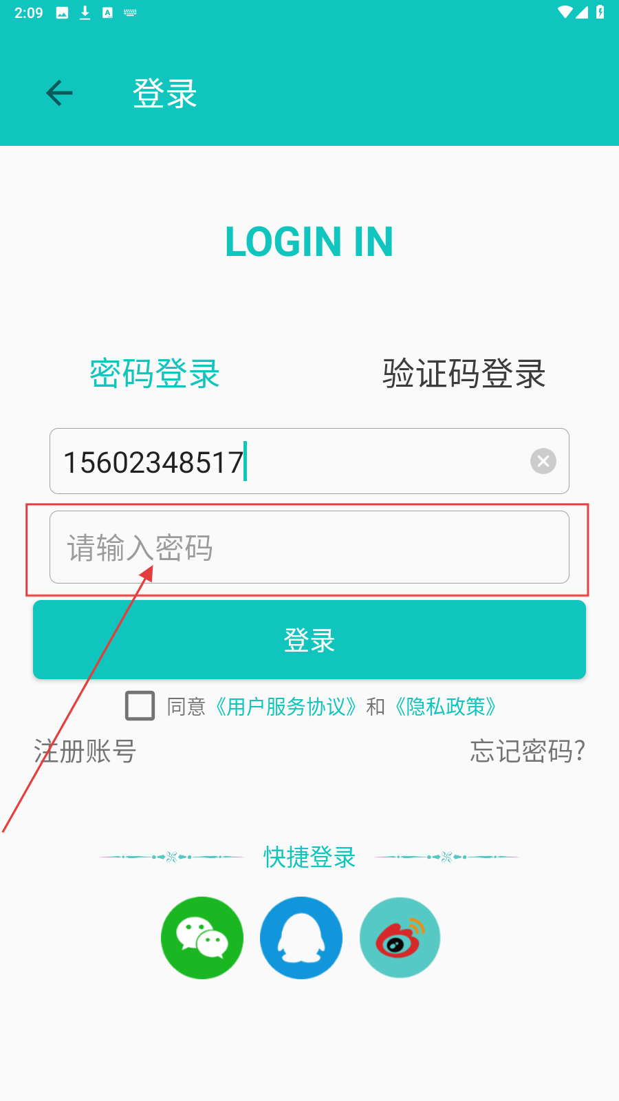 2、在密码框输入对应密码,勾选同意协议。
