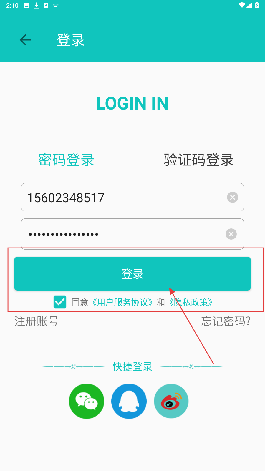 3、点击【登录】完成登录;也可切换【验证码登录】或用快捷登录(微信、QQ、微博)。