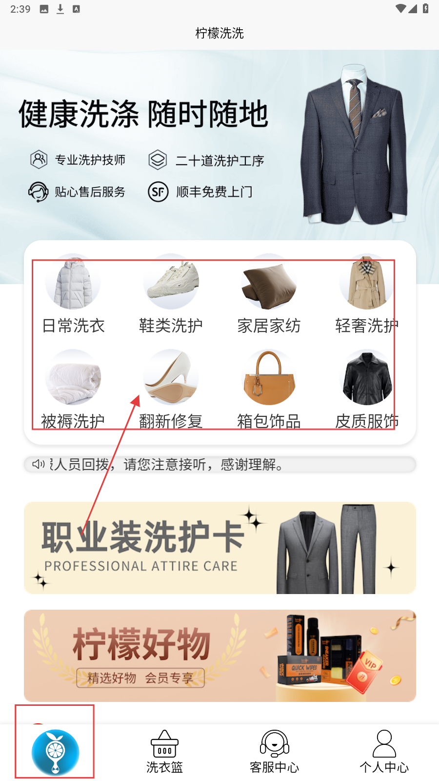 1、进入【首页】,有健康洗涤服务(日常洗衣、鞋类洗护等),点击对应图标选服务类型。