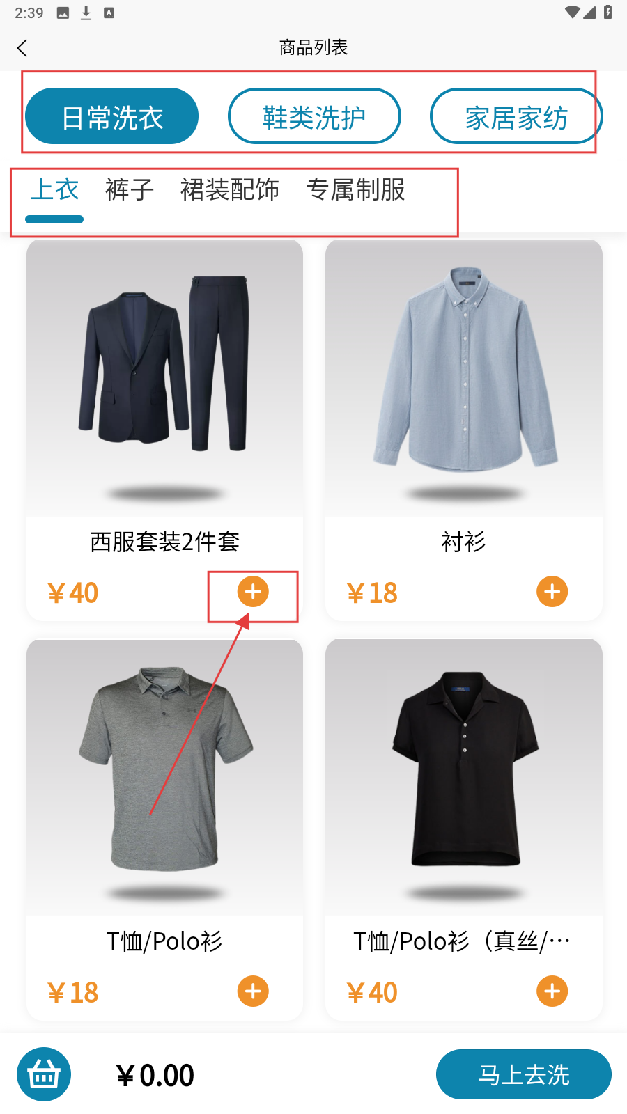 2、在商品列表页,切换“日常洗衣”“鞋类洗护”“家居家纺”分类,选“上衣”“裤子”等子分类,点商品【+】号加入洗衣篮。