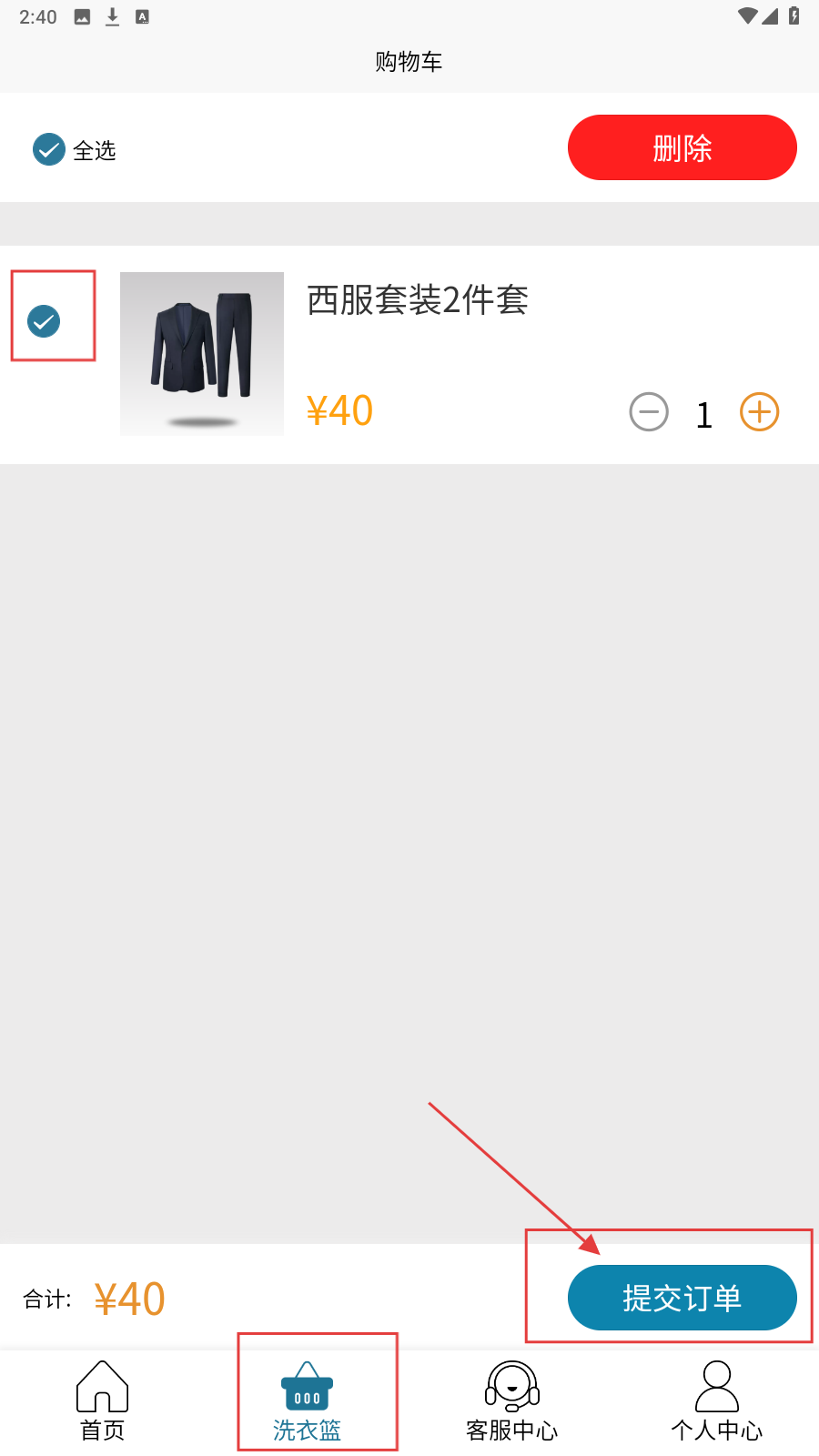 3、进入【洗衣篮】,勾选商品(如西服套装2件套),可增减数量、删除,确认后点“提交订单”,完成洗衣服务下单。