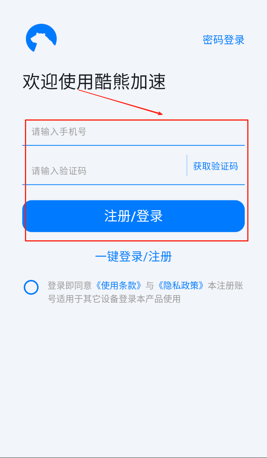 2、选密码登录页输入手机号点获取验证码,短信来后填入框里,点注册登录合并按钮就能进入,偷懒可选一键登录勾协议条款哦。
