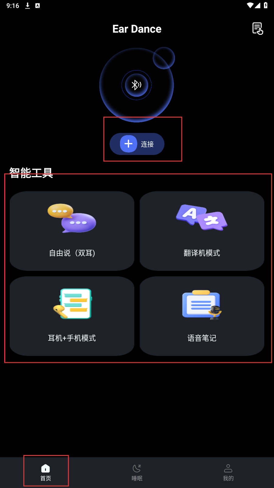 1、进入【首页】(EarDance),点“连接”配对设备,用“自由说(双耳)”“翻译机模式”等智能工具,底部切“睡眠”“我的”。