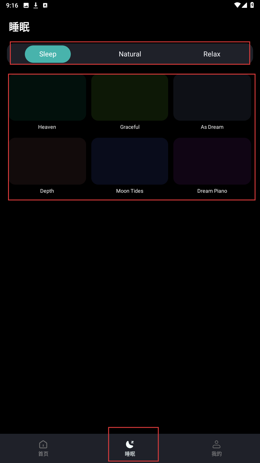 2、切换到【睡眠】页,选“Sleep”“Natural”“Relax”模式,点“Heaven”“Graceful”等音效,体验助眠内容。