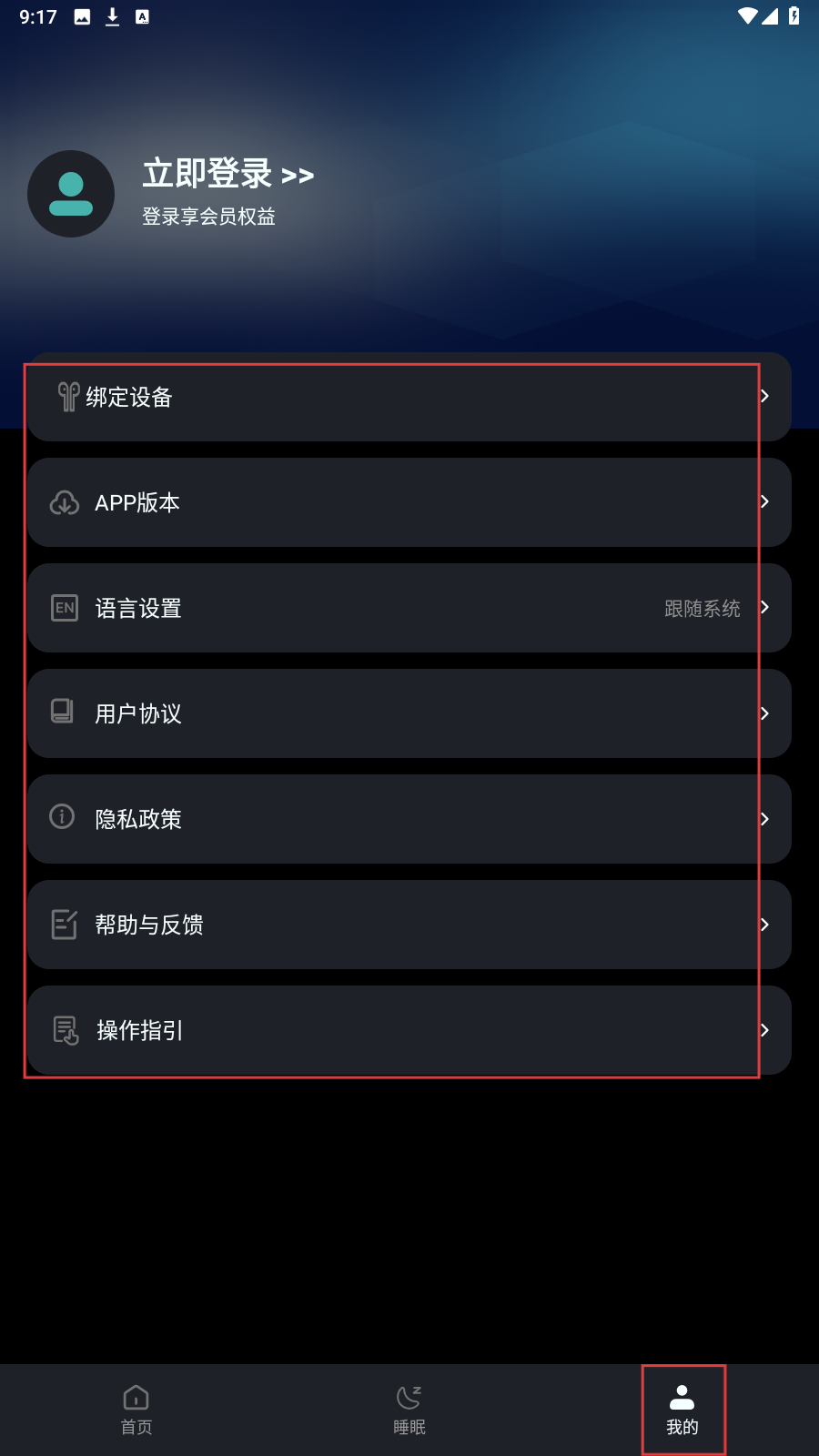 3、进入【我的】页,可“立即登录”享权益,操作“绑定设备”“APP版本”“语言设置”等,查看用户协议、反馈问题。