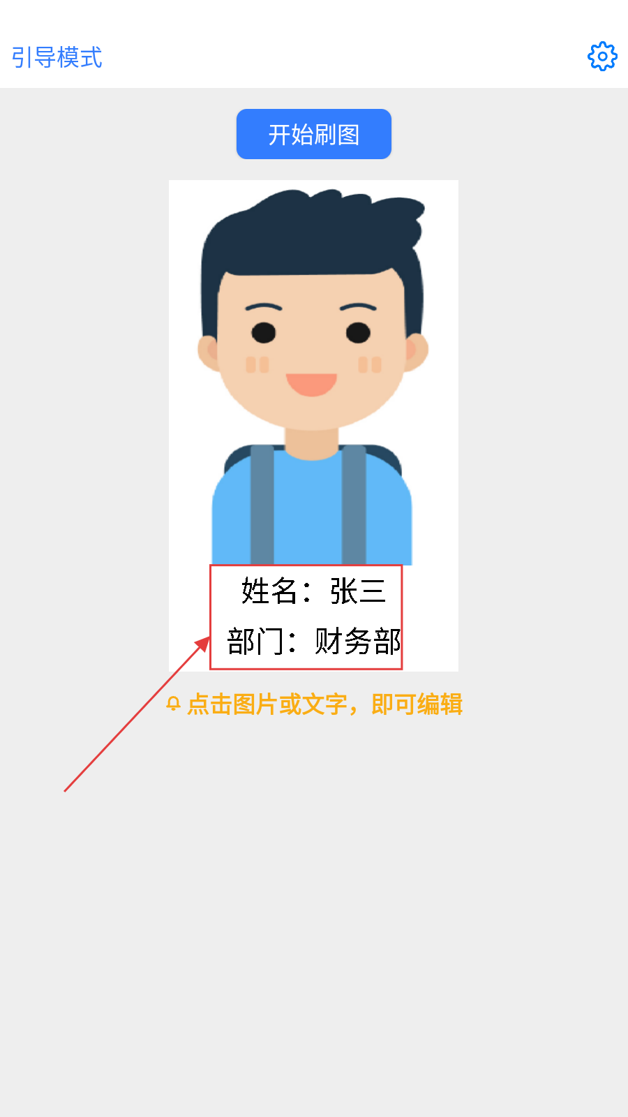 1、进入应用,显示姓名“张三”、部门“财务部”,点击文字/图片可编辑。