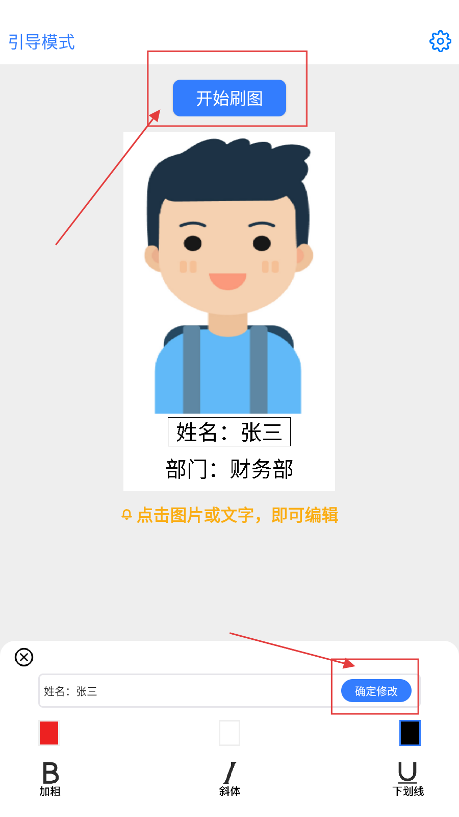 2、编辑姓名(如确认“张三”),选字体样式(加粗等),点【确定修改】保存,再点【开始刷图】传输工牌信息。