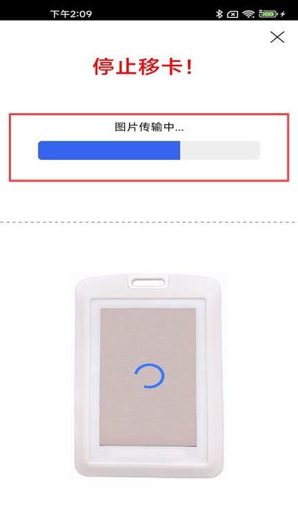 3、进入“停止移卡!图片传输中…”页面,等待进度条完成,完成工牌图片传输,更新工牌信息(姓名、部门等)。