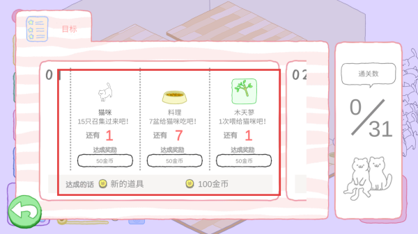 1、查看任务目标,按要求召集15只猫咪、准备7盆料理、喂1次木天蓼,完成可获金币及新道具奖励,助力游戏推进。