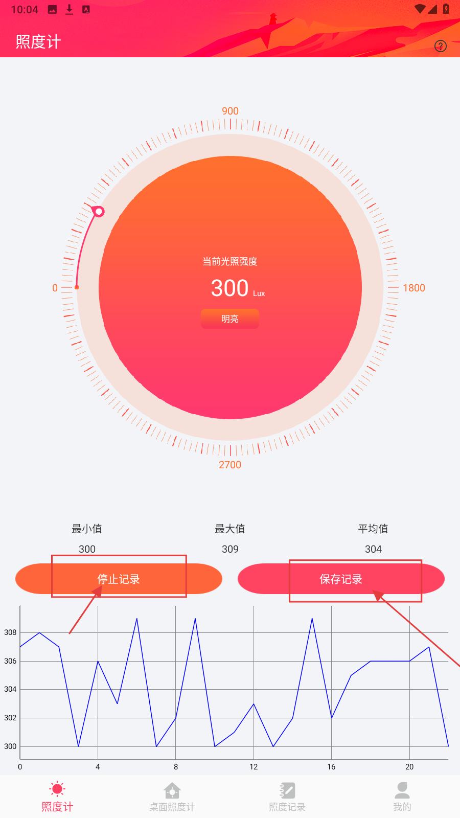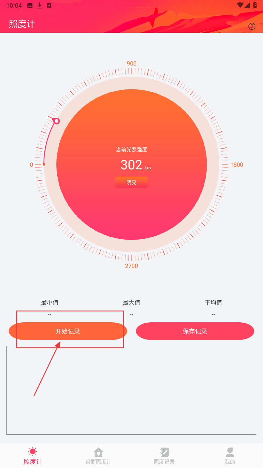 1、进入【照度计】界面,显示当前光照强度,点击【开始记录】监测数据,底部可切换【桌面照度计】【照度记录】【我的】功能。