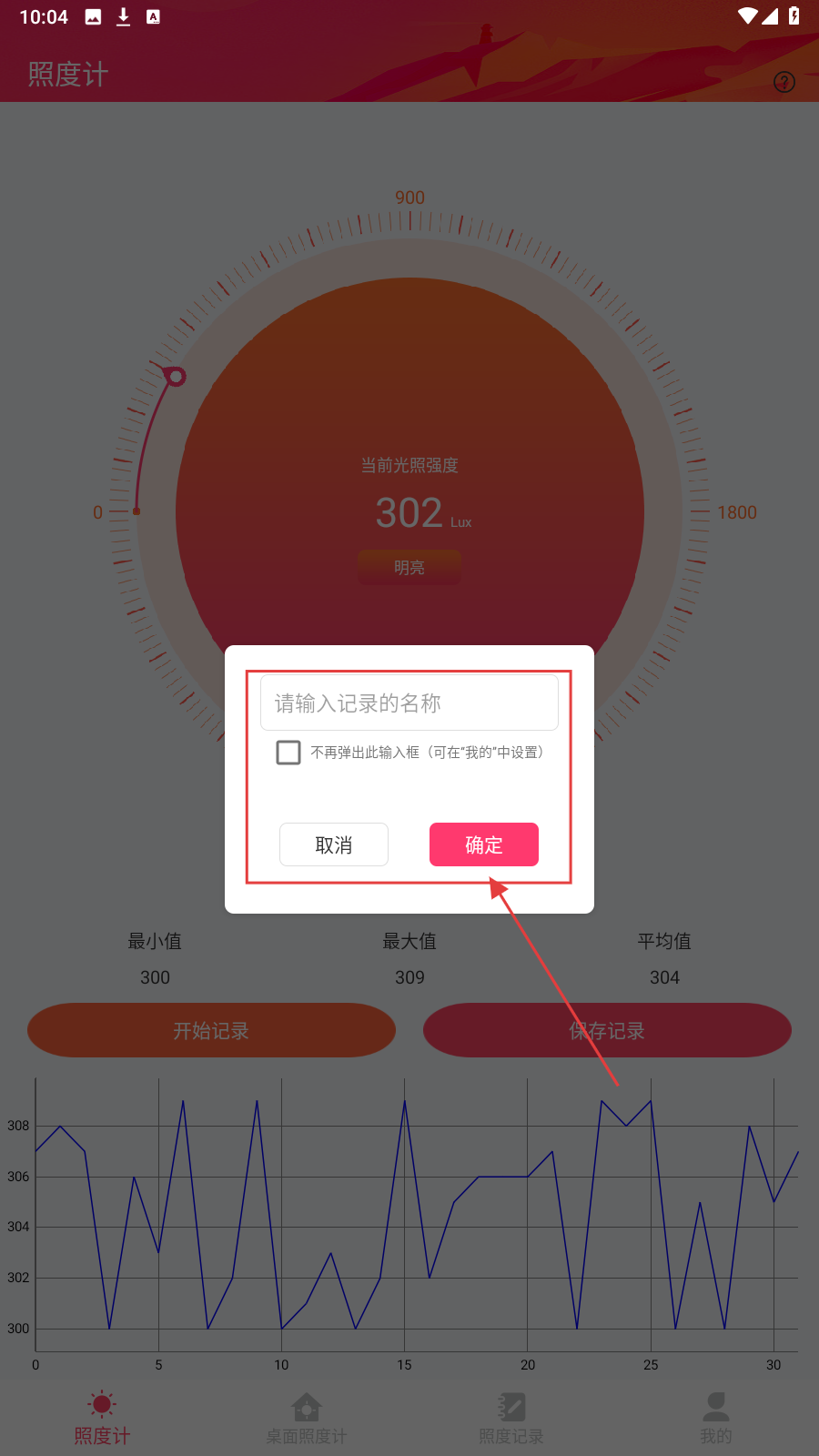 3、在保存弹窗,输入记录名称,可选【不再弹出此输入框】(可在“我的”中设置),点击【确定】保存,到【照度记录】查看历史数据。