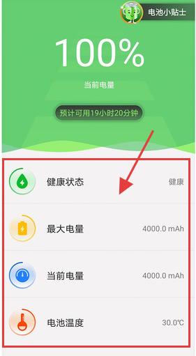 1、进入电池小卫士页面,显示当前电量、预计可用时间,查看【健康状态】、【最大电量】等信息,了解电池基本数据。