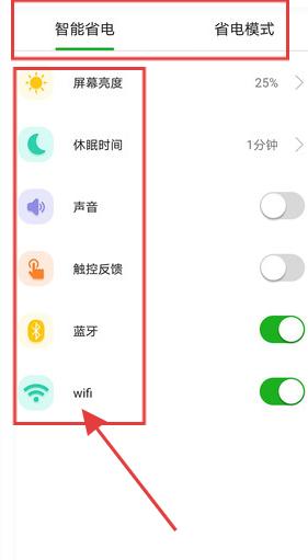 2、切换到省电设置页,选【智能省电】或【省电模式】,调整【屏幕亮度】、【休眠时间】等,开关【声音】【触控反馈】等功能。