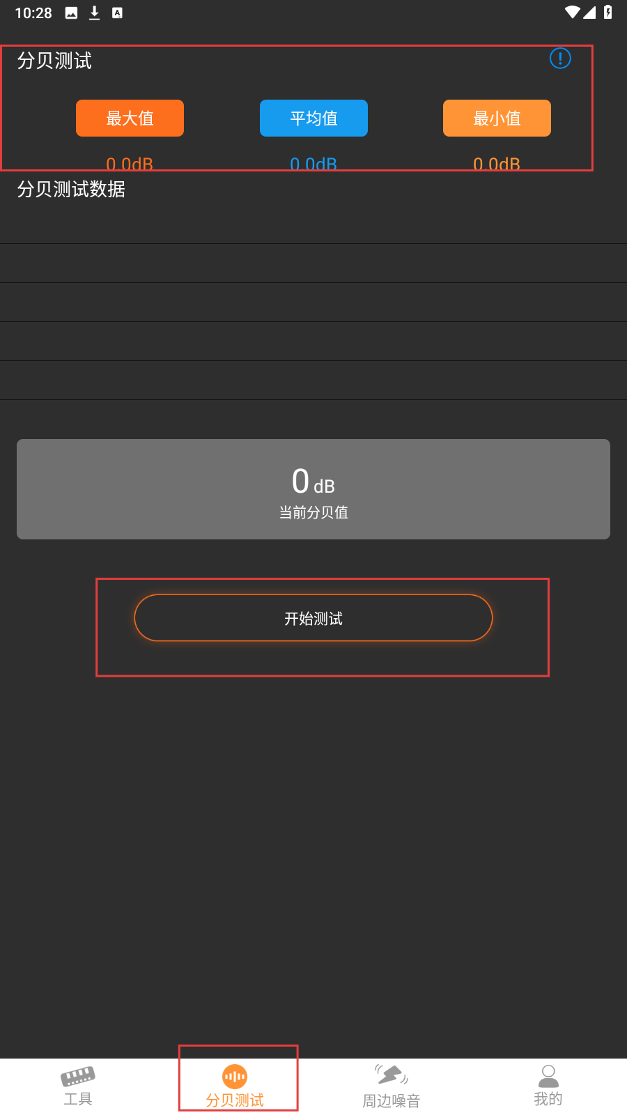 2、切换到【分贝测试】页,显示【最大值】【平均值】【最小值】,点击【开始测试】监测环境分贝,数据实时更新。