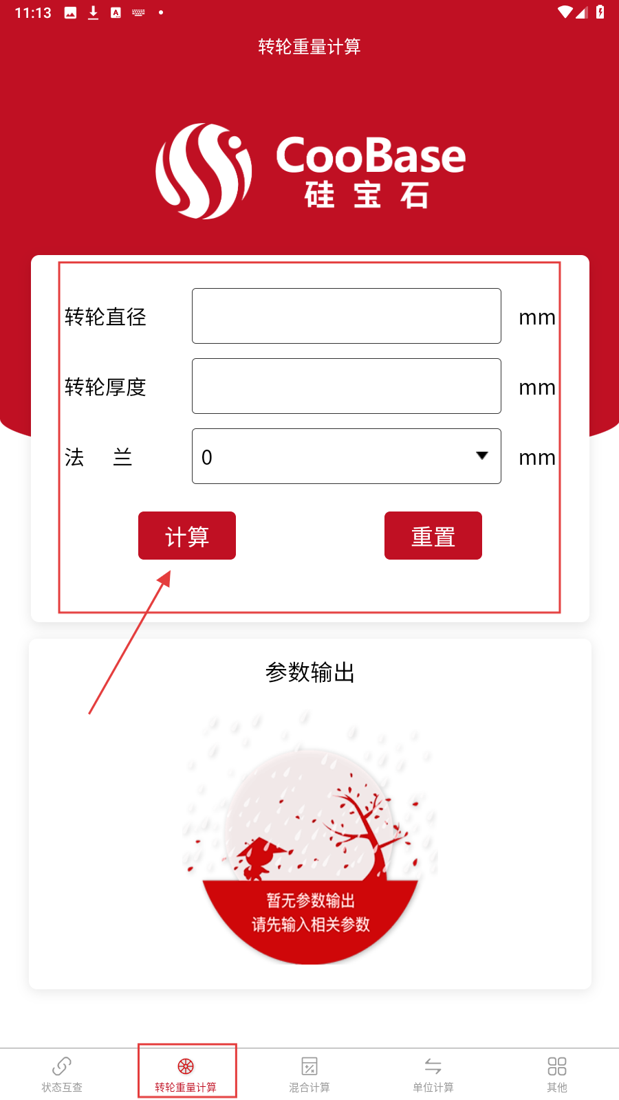 2、切换到【转轮重量计算】页,填转轮直径、厚度、法兰(0mm),点【计算】得结果,点【重置】清空,按需用计算功能。