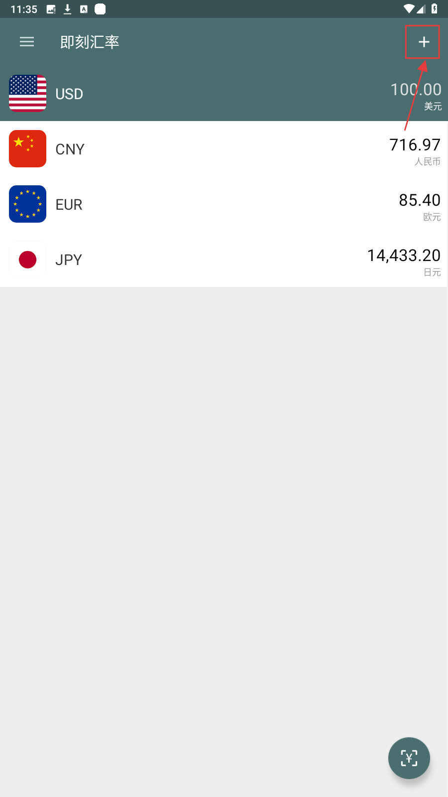 1、进入“即刻汇率”应用主页,显示USD(100.00美元)、CNY(716.97人民币)等汇率,点击右上角【+】,进入货币选择页。