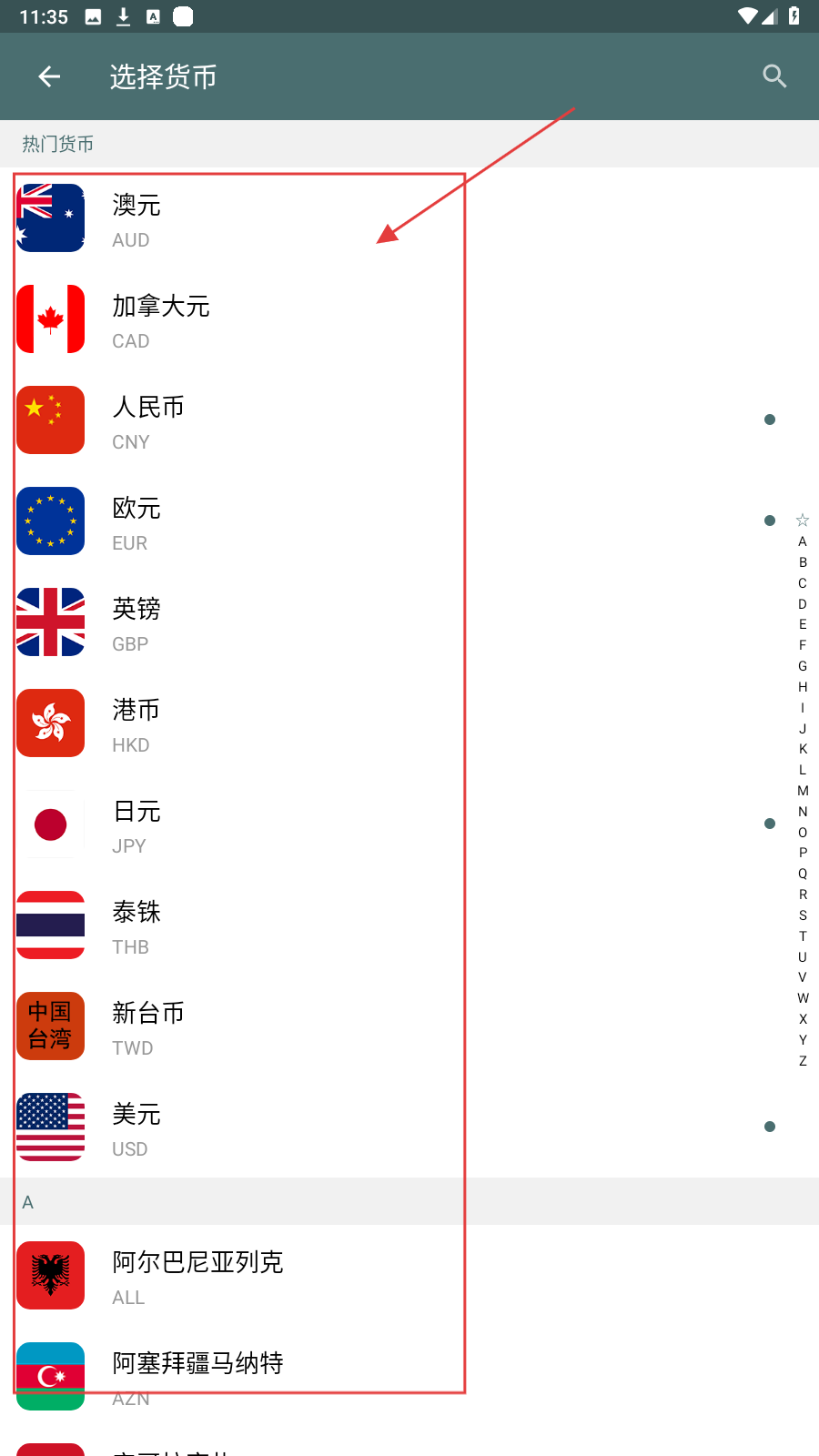 2、在【选择货币】页,选热门货币(澳元AUD、加拿大元CAD等)或字母索引找货币,点击添加到汇率列表。