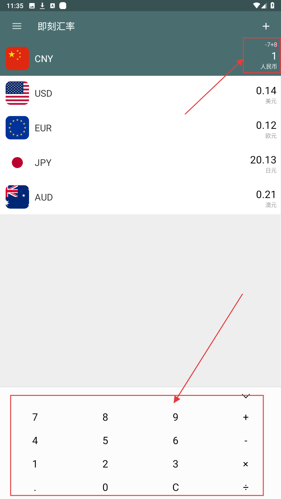 3、添加货币后,返回汇率主页,点击货币栏,弹出数字键盘,输入金额,计算该货币与其他货币兑换值,按需查看汇率换算结果。